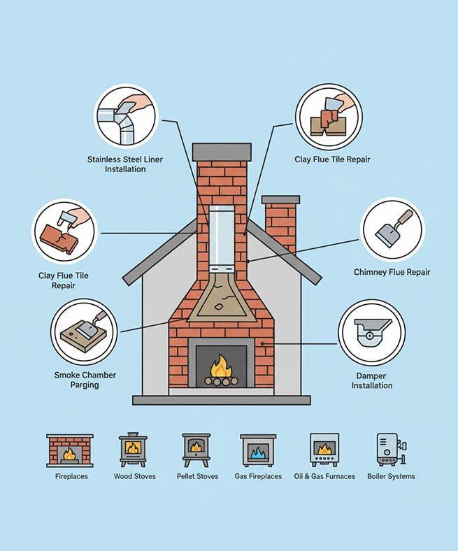 We repair cracked flue tiles or replace sections using professional tile-breaking and resetting techniques.